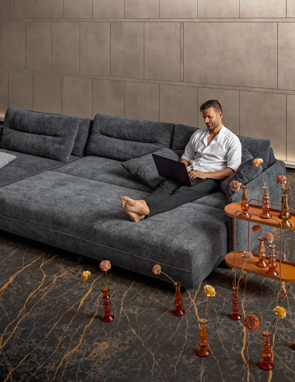 Sofisticato e versatile, il divano Clock si distingue per linee decise e configurazioni dinamiche.