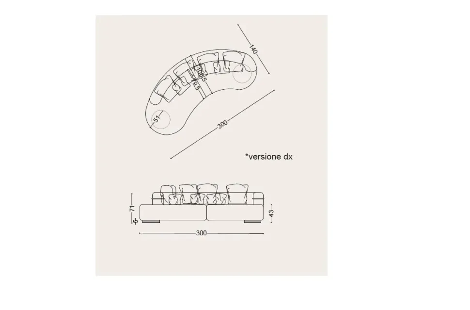 Lunghezza totale 3 metri altezza da terra fin sopra seduta 43 cm