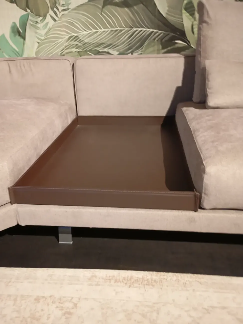 COMPLETO DI VASSOIO IN CUOIO TESTA DI MORO, PIEDI A LAMA COLORE PELTRO, POGGIATESTA POSTERIORI, CUSCINI POGGIARENI E CUSCINI ORNAMENTALI.
