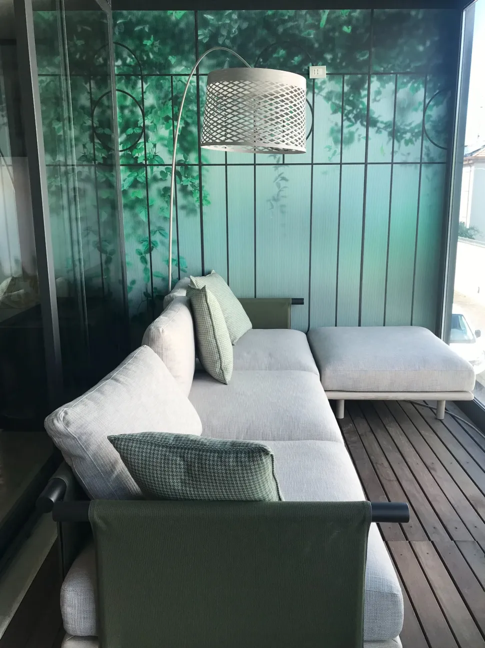 Schienali in materiale tecnico per esterni, colore verde scuro e grigio, cuscini volanti compresi.