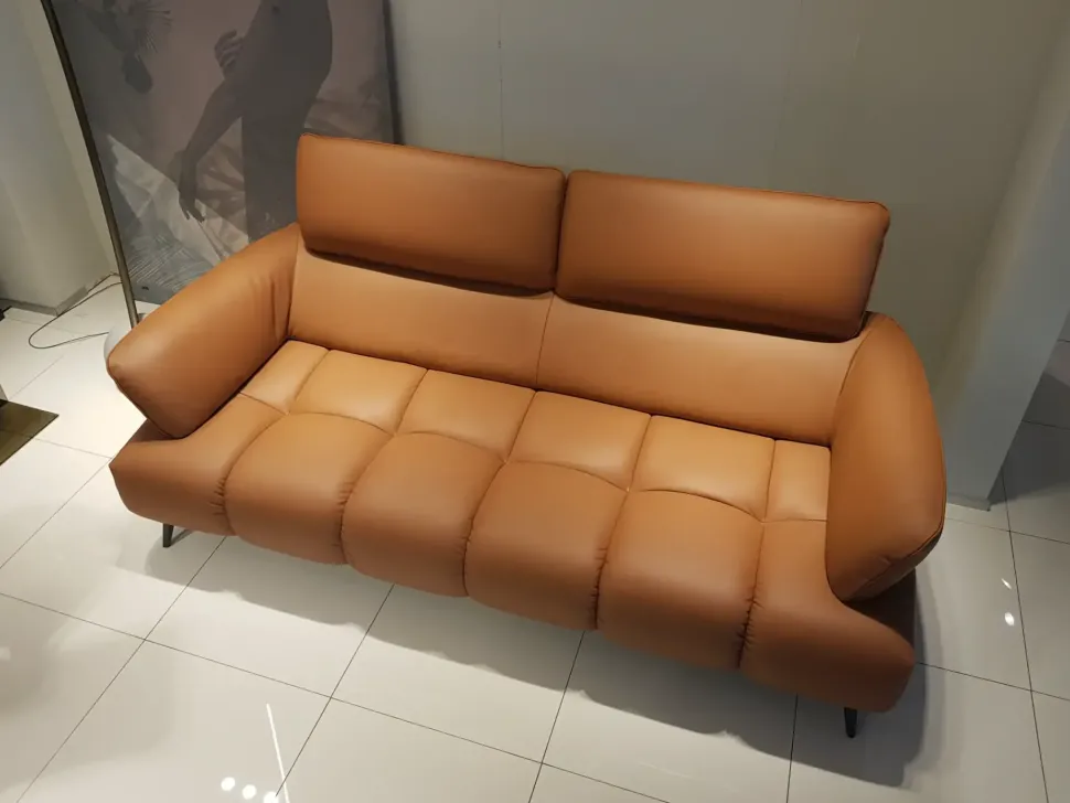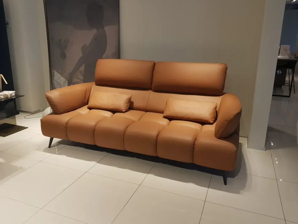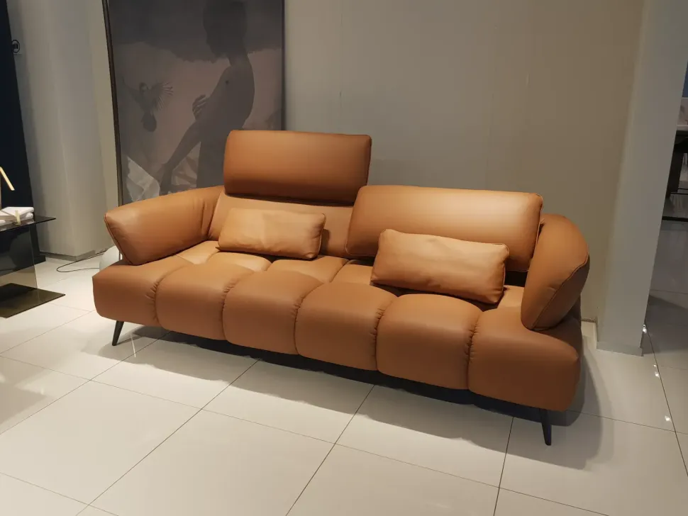 Divano di design in pelle di alta qualità color cognac con piedini e meccanismo alza poggiatesta neri opachi.