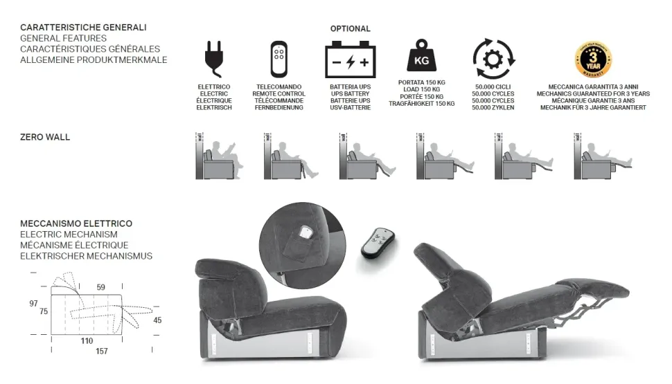 Il divano è dotato di SEDUTE ELETTRIFICATE con seduta e poggiatesta indipendenti che permettono di passare dalla posizione seduta a quella sdraiata grazie ad un telecomando dedicato.