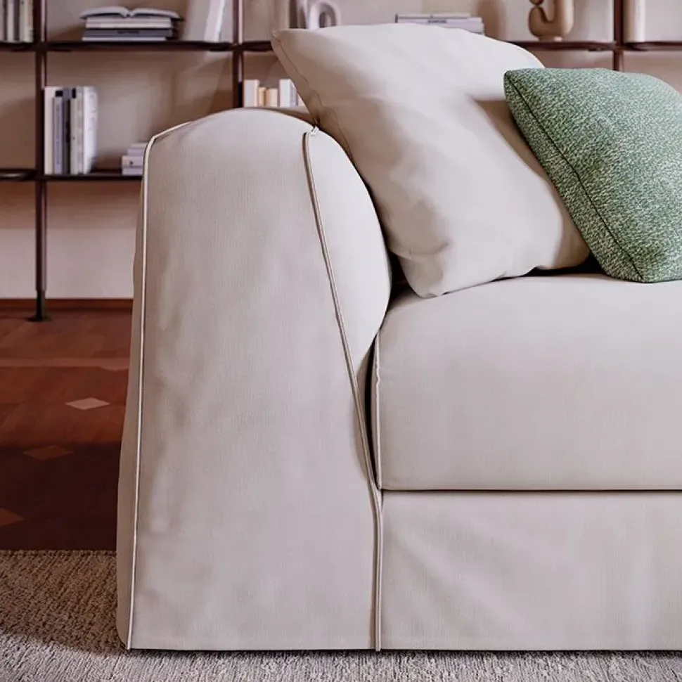 Il carattere distintivo di questo divano sfoderabile risiede nella perfetta fusione di eleganza e praticità: il rivestimento, arricchito da cuciture a vista, scivola lungo la silhouette del divano, coprendo con grazia i piedini e dando vita a morbidi drappeggi. Un tessuto pratico e versatile, che può essere facilmente sostituito per rinnovare il look del divano in ogni momento.