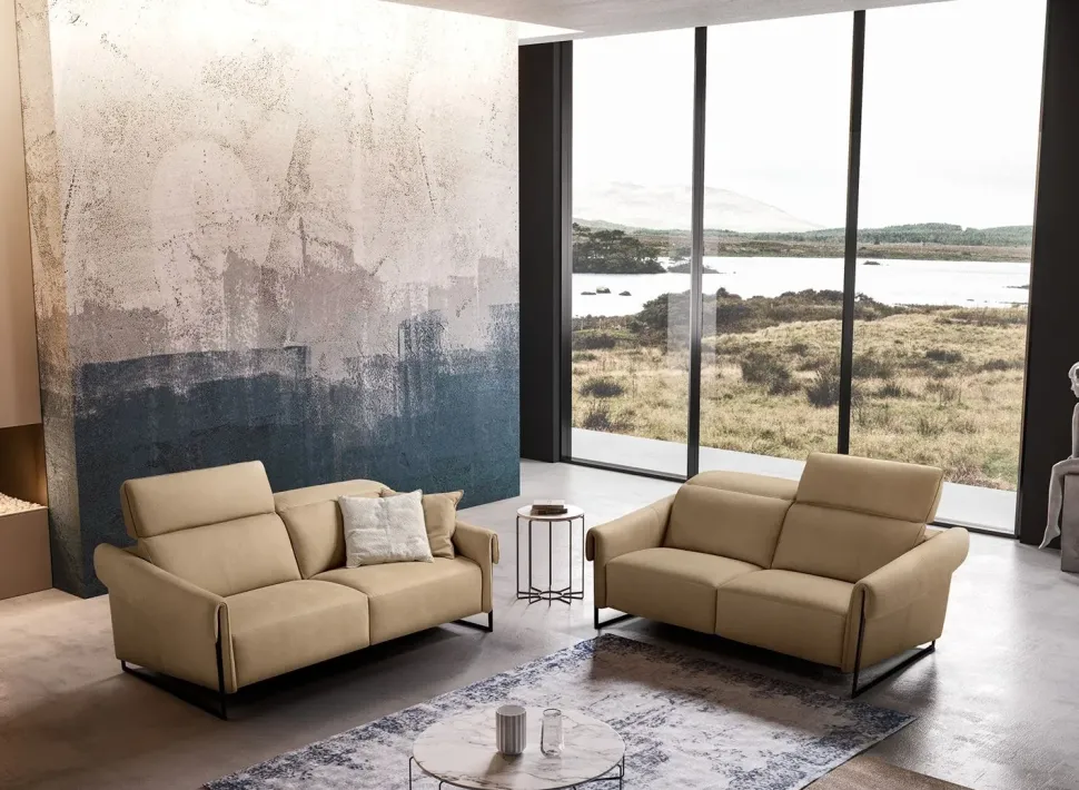 Selfie è un divano dalla personalità giovane e grintosa, la versione 3 posti è dotata di un doppio motore che permette a ogni seduta di gestire in modo indipendente la funzione recliner di spalliera e poggiapiedi. Particolare il laterale grazie al taglio inclinato del fianco bracciolo e la parte frontale del bracciolo con una mantellina che avvolge il piede a slitta. Il rivestimento in pelle effetto nabuk nei colori crema e giallo intenso.