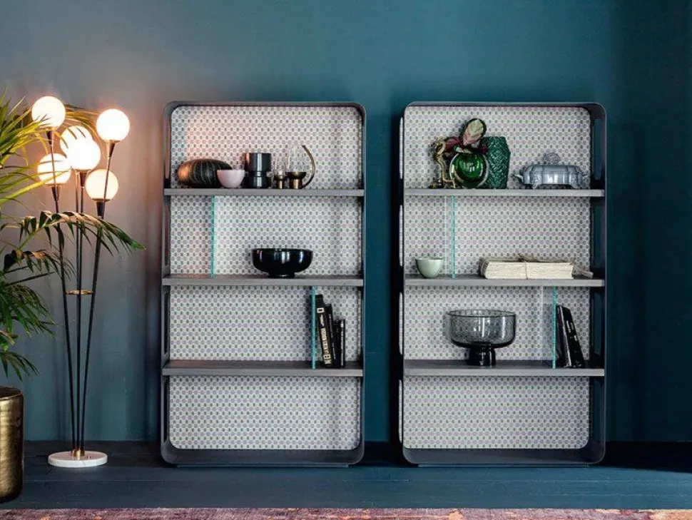 La libreria Academy di Devina Nais in stile vintage con schienale in tessuto mentre la struttura in metallo con gli angoli arrotondati.