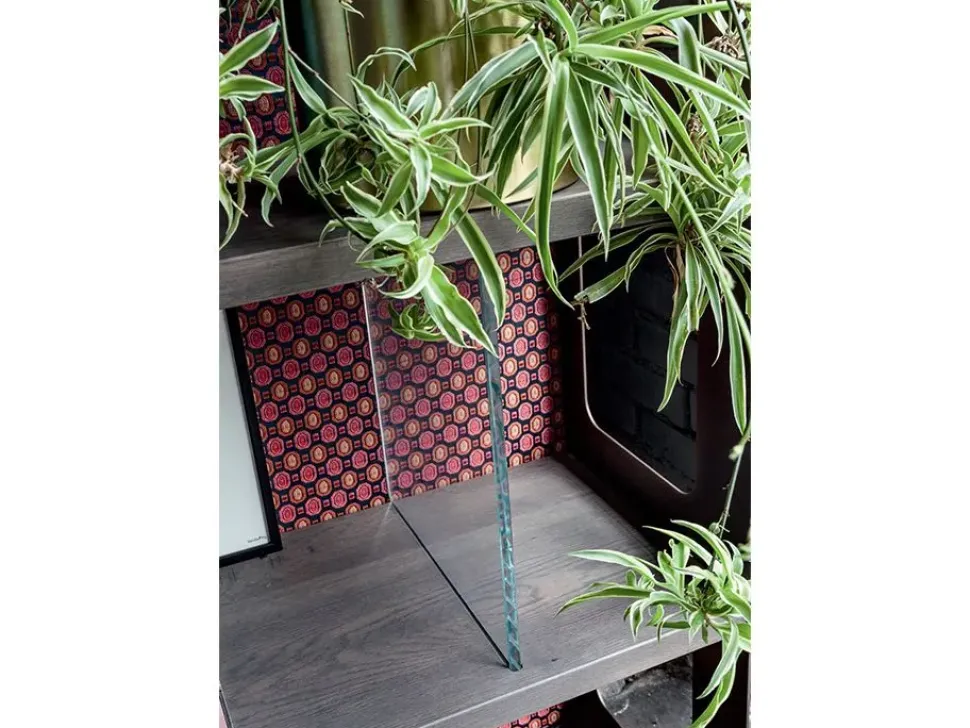 I ripiani in legno rimane parte centrale nel trattamento degli scaffali, ma si circonda di altre materie nobili come i divisori in vetro.