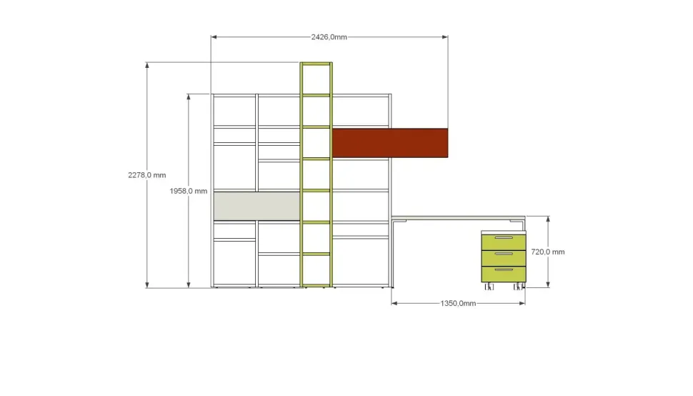 Composizione libreria con scrittoio e cassettiera 4 cassetti. Adatta come completamento di una camera ragazz* o come allestimento per una zona studio o smart working.