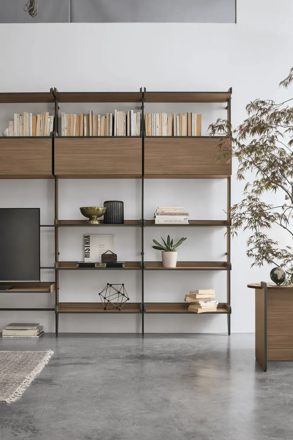 Linee decise e materiali di qualità contraddistinguono tutte le librerie Tomasella: scopri il modello in metallo qui presente e completa il soggiorno.