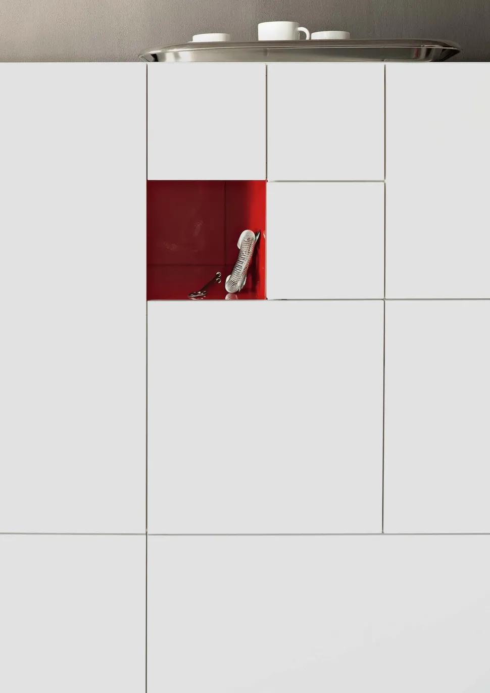 Un disegno dal forte impatto grafico che ne movimenta la superficie: i vani chiusi da ante laccate vanno gradualmente a rimpicciolirsi come in un’ideale spirale che si conclude in uno spazio vuoto, origine e fine di questo movimento infinito. Personalizzabile usando liberamente, anche a contrasto, più colori per le ante e l’interno del vano a giorno.