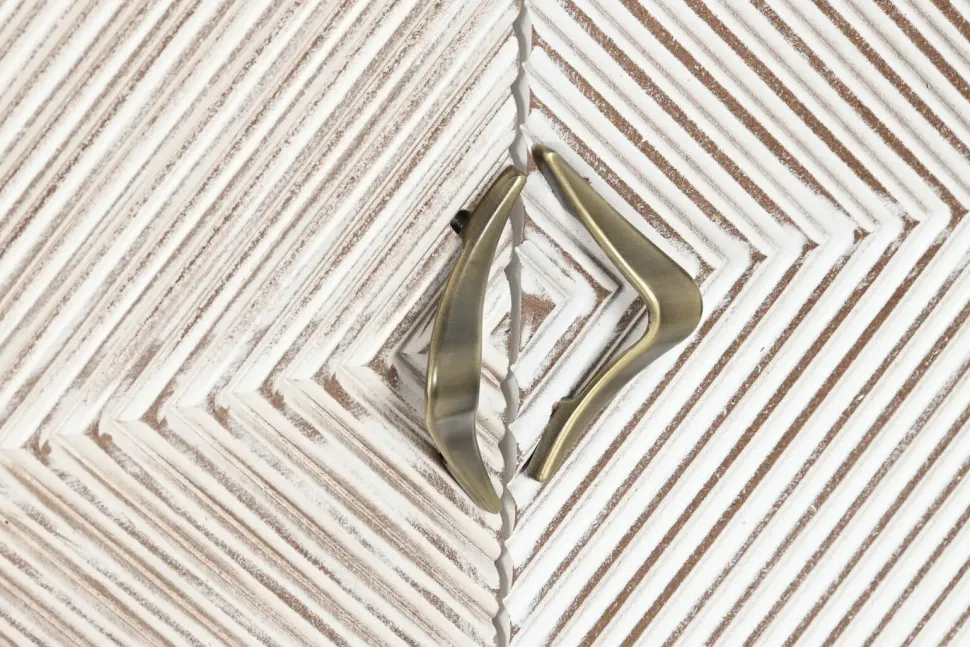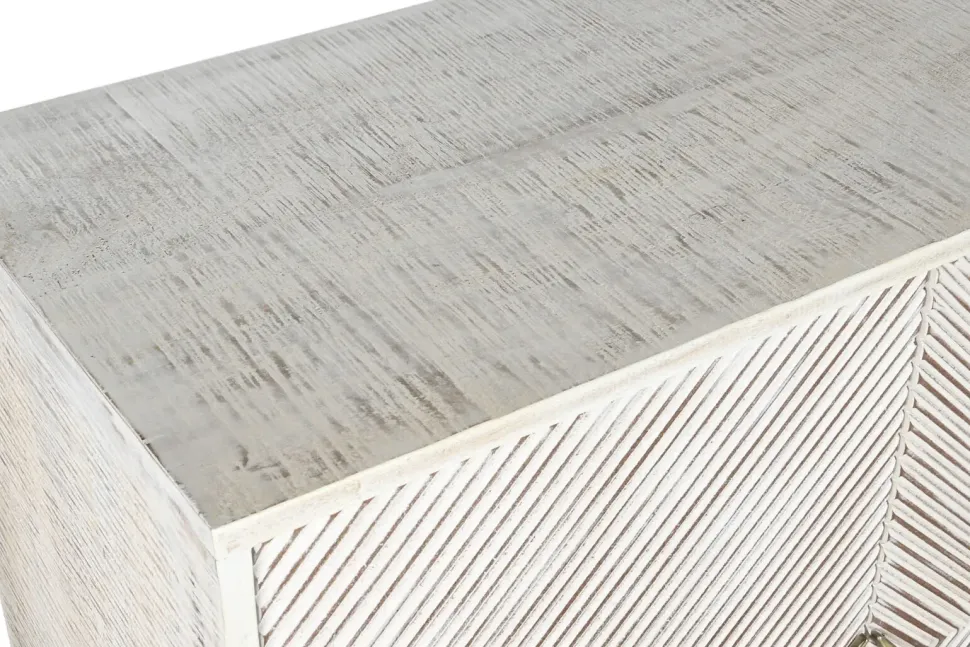 Credenza Mango Decapata 170 , credenza costruita artigianalmente in legno massello di mango, con finitura decapata bianco. Ante finemente intagliate a mano con maniglia in colore oro. Composta da 4 ante con mensola interna.