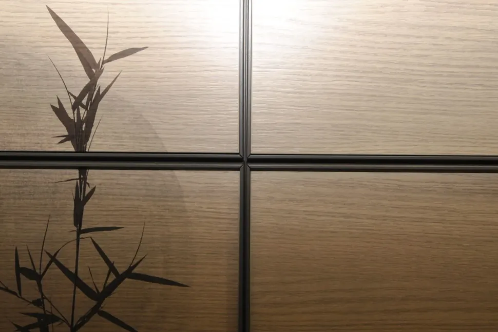 Frontali Vinci in materico Rovere Sabbia con grafica V1102W e telaio in metallo laccato opaco Fango.