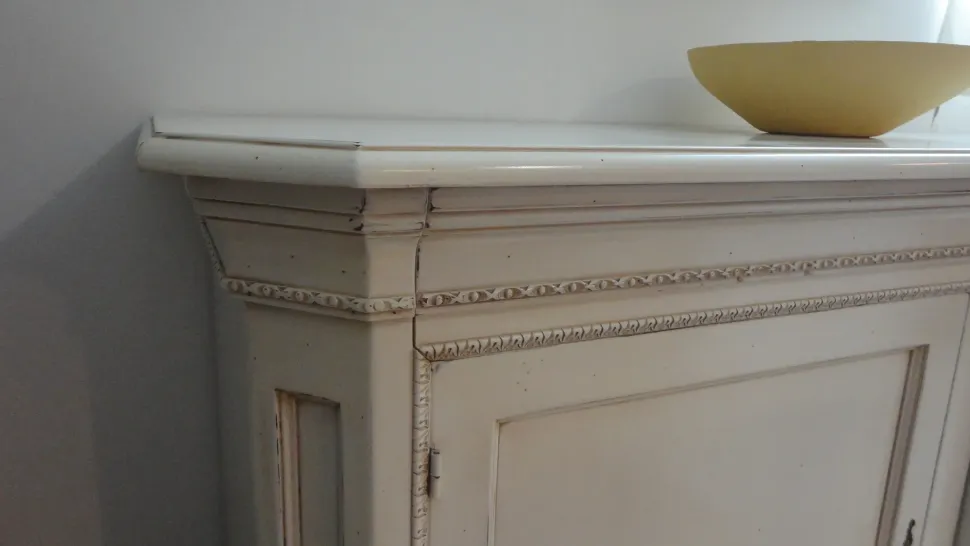 La credenza è in legno massello in finitura patinato bianco, ed è composta da due ante ad apertura battente.