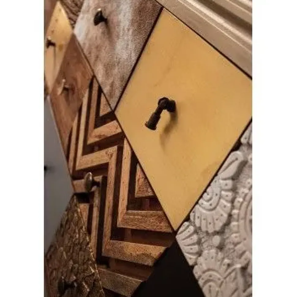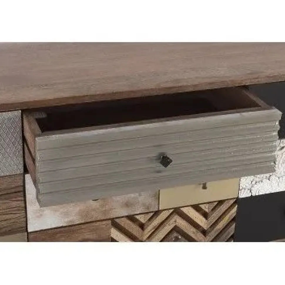 Struttura in legno di mango,schienale in mdf,frontale ante in legno riciclato mango e acacia, struttura cassetti in mango ed acacia. finitura con vernice a base d’acqua. vano comprensivo di mensola. maniglia in acciaio