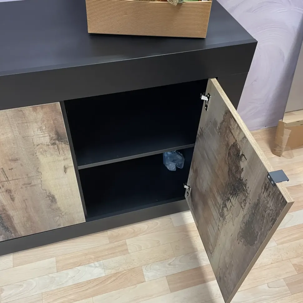 madia moderna a tre ante (non rallentate ) in laminato , ripiano interno , scocca nera e ante in effetto legno vecchio misura L 160 x H 86 P 42 cm
