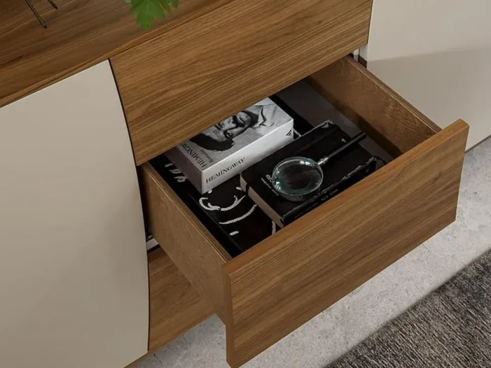 La madia Ermes assottiglia i suoi fianchi e riprende le stesse linee curve nella definizione dei cassetti centrali. La struttura in Noce canaletto si staglia dolcemente oltre il top, incorniciandolo con un’alzatina sagomata. Le ante laccate sabbia mantengono i toni caldi del legno.