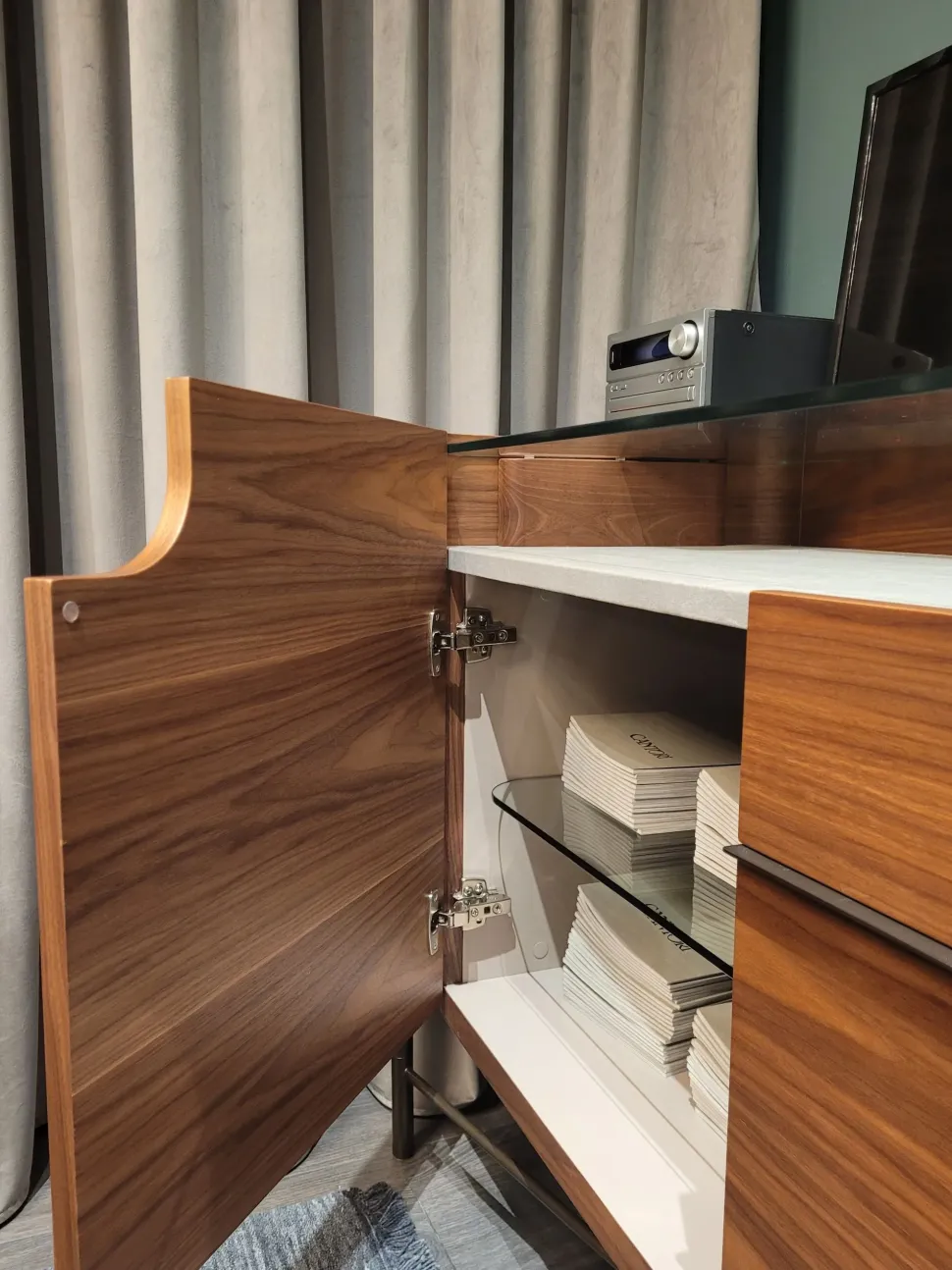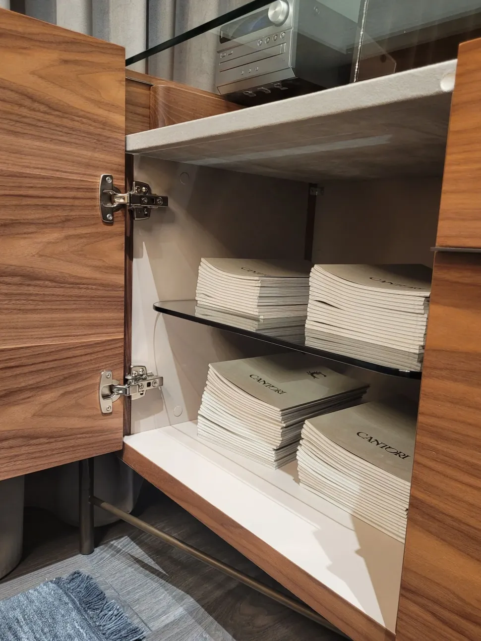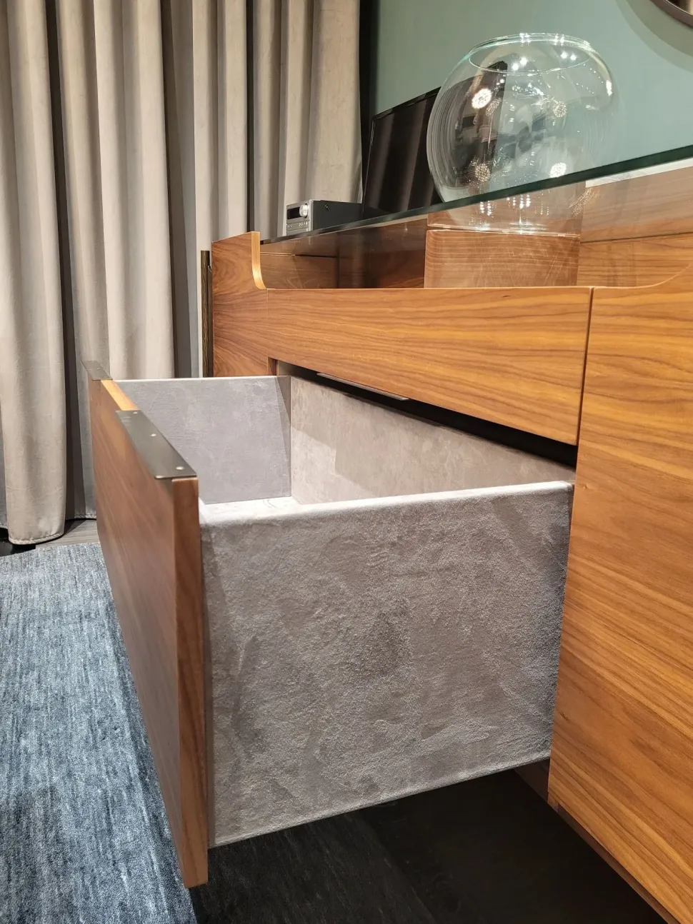 Il vano Sottotop rivestito in econabuk, lo rende un raffinato espositore di oggetti da collezione e di valore.
