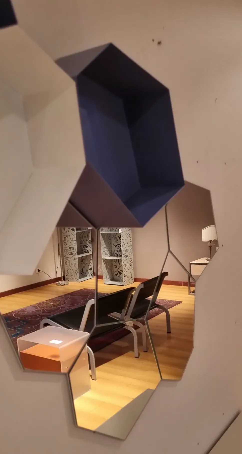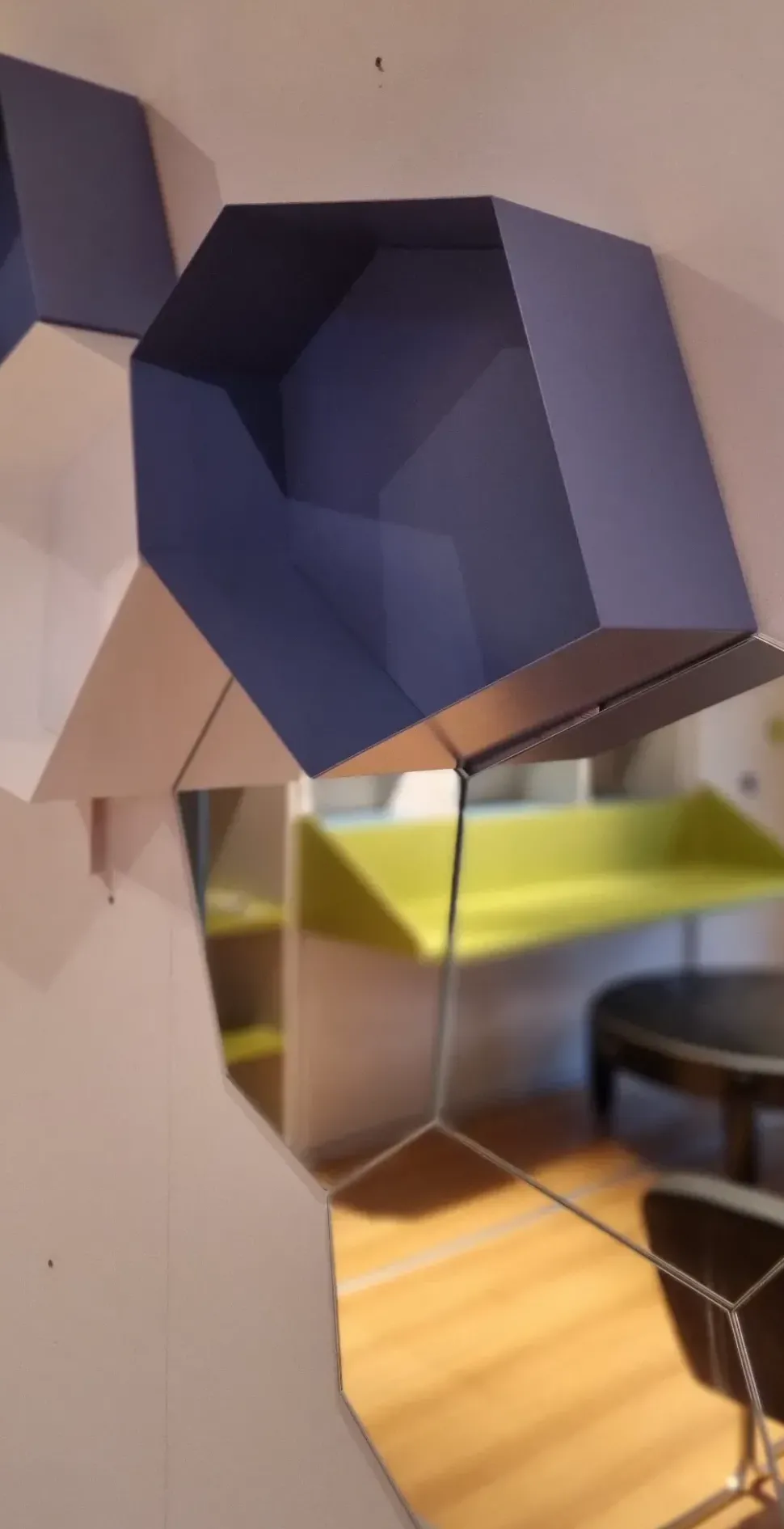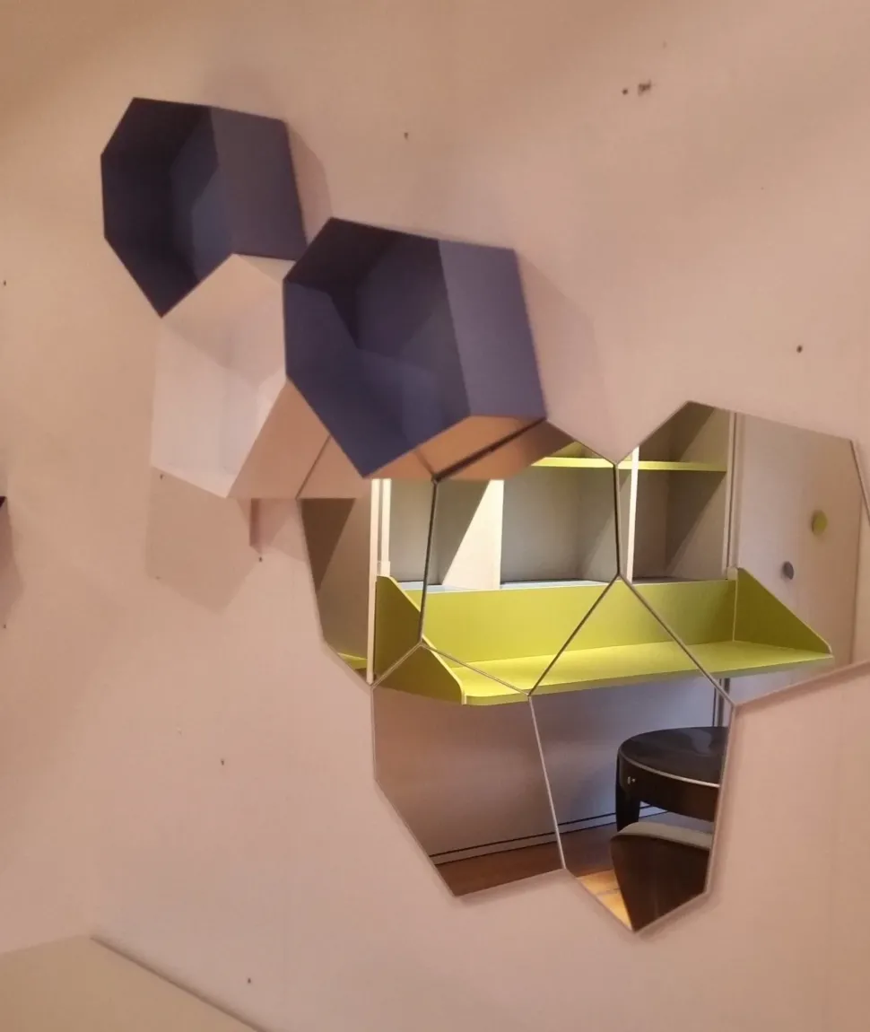 Calligaris Moss è un complemento originale e versatile composto da elementi specchio ed elementi contenitore in metallo laccato sky blue opaco di forma esagonale che completano la composizione.