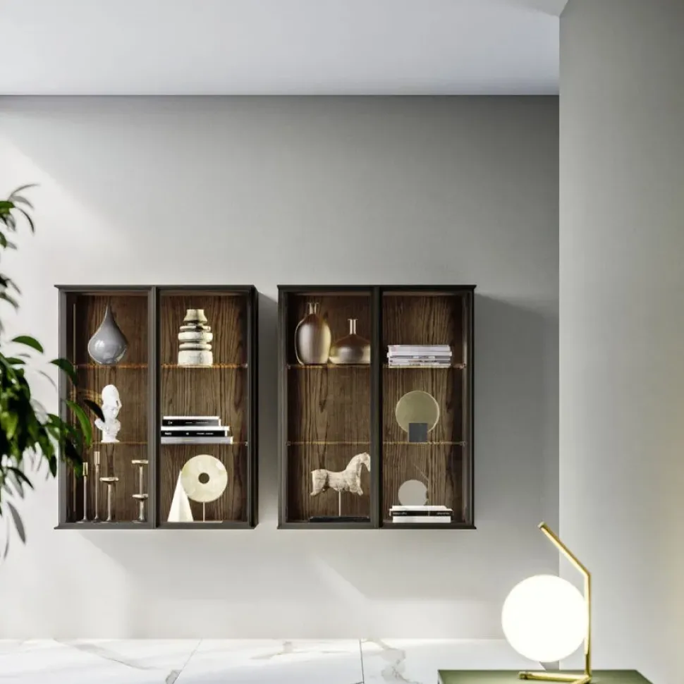 Pensile con cassetto P 420 mm, casellari Unit in metallo laccato, Teke in vetro con ante Glass vetro trasparente (NON COMPRESE NEL PREZZO)