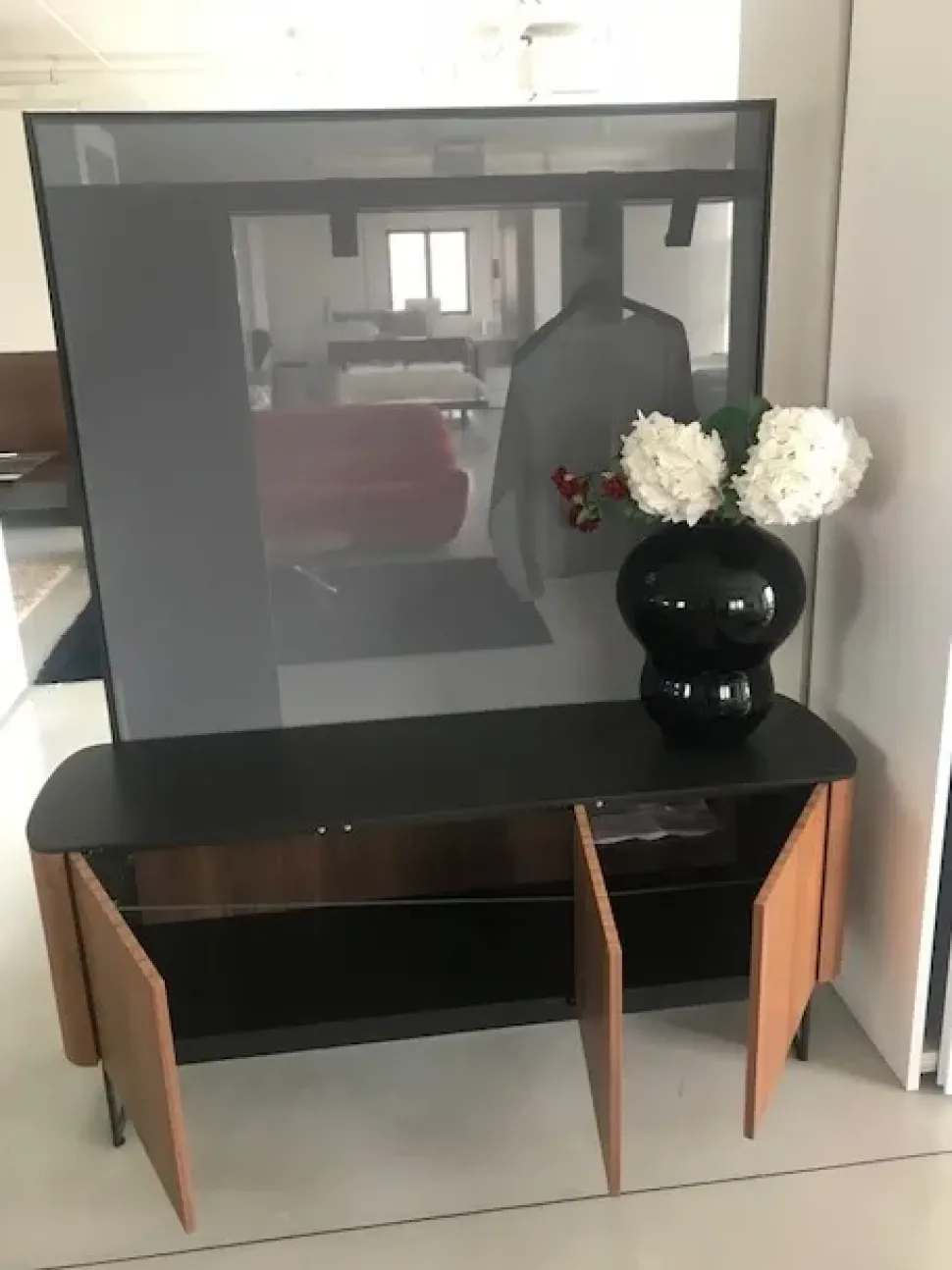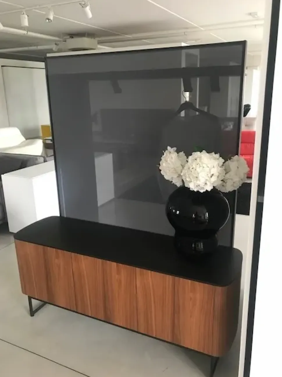 Il telaio dell’alzata del mobile è in alluminio laccato nero, con telo screen grigio pietra.