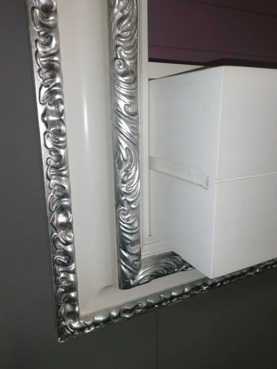 Dimensioni cm 161 x 128 x 36 ( dimensioni vano tv cm 135 x 80 ) in finitura laccato opaco e cornice intagliata in foglia argento.