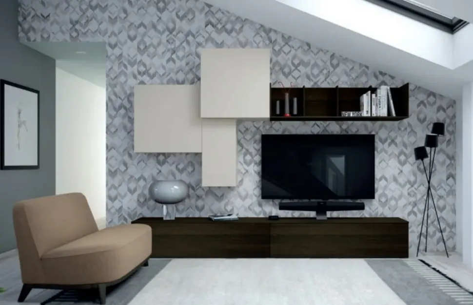 Questa composizione per il living sarà la scelta ideale se vuoi una parete attrezzata push–pull dalle forme decise.