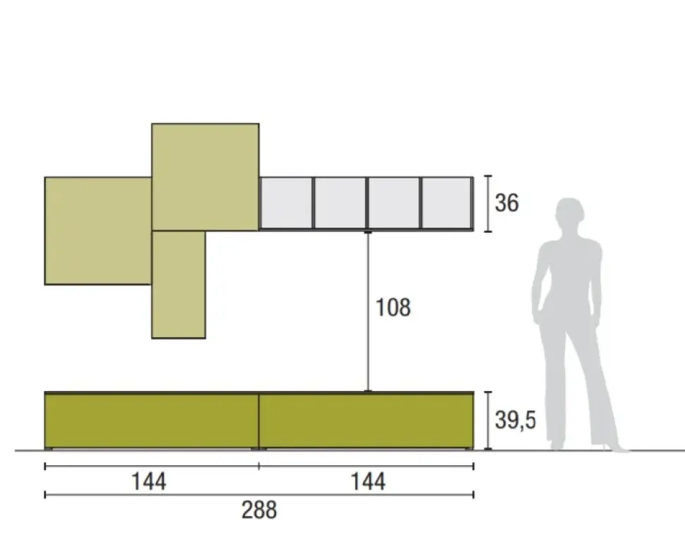 La larghezza della composizione qui visibile, che va da 251 a 300 cm, è tale da rendere questo modello idoneo ad essere inserito in ambienti di varie dimensioni.