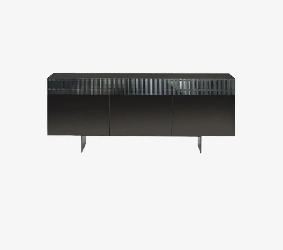 La madia Cannetè si inserisce armoniosamente in ogni tipo di ambiente, con la sua truttura in laccato nero, ante in specchio fumè o bronzo e cornice superiore in vetro cannettato dalla particolare lavorazione rigata che ne impreziosisce la purezza della forma.