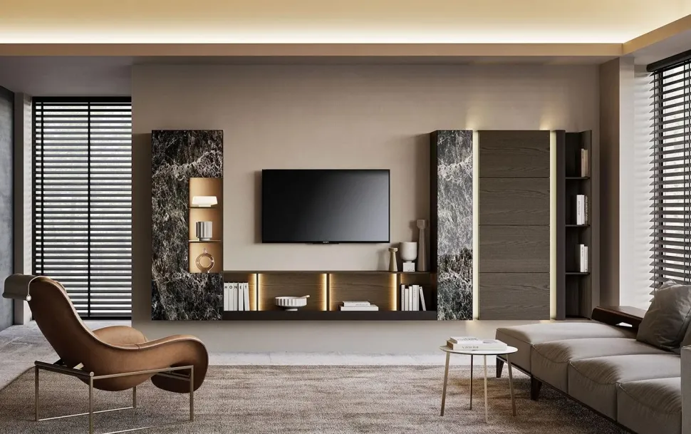 La zona giorno si compone di diversi mobili e complementi capaci di completare lo spazio usufruendo al meglio di ogni angolo; tra questi c’è sempre una parete attrezzata come il modello Composizione horizon 1001 di Mobilgam presente in foto, studiata per dare vita a un soggiorno operativo e pratico.