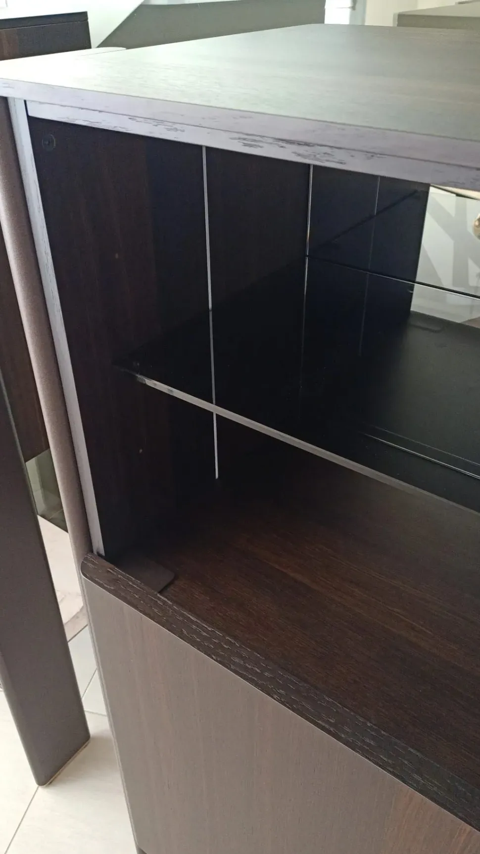 Il corpo della madia, realizzato in legno pregiato, è sorretto da tre gambe dagli spigoli smussati. La particolarità sta nella funzione avvolgente delle gambe, che affiancano il cassone fino alla sua sommità e che sono a tutti gli effetti un elemento decorativo molto presente. Alla base, un sottile bordo in acciaio color ottone si abbina alla maniglia decorativa al centro dell’anta scorrevole, la quale risalta per la sua intensità sul fondo scuro.
