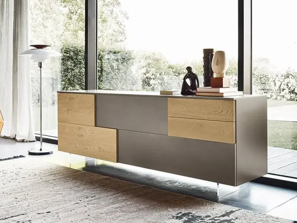 In questo caso la madia Incontro evidenzia il suo valore grafico abbinando, oltre alla finitura impiallacciata e laccata, la modularità in larghezza e altezza degli elementi che la compongono.