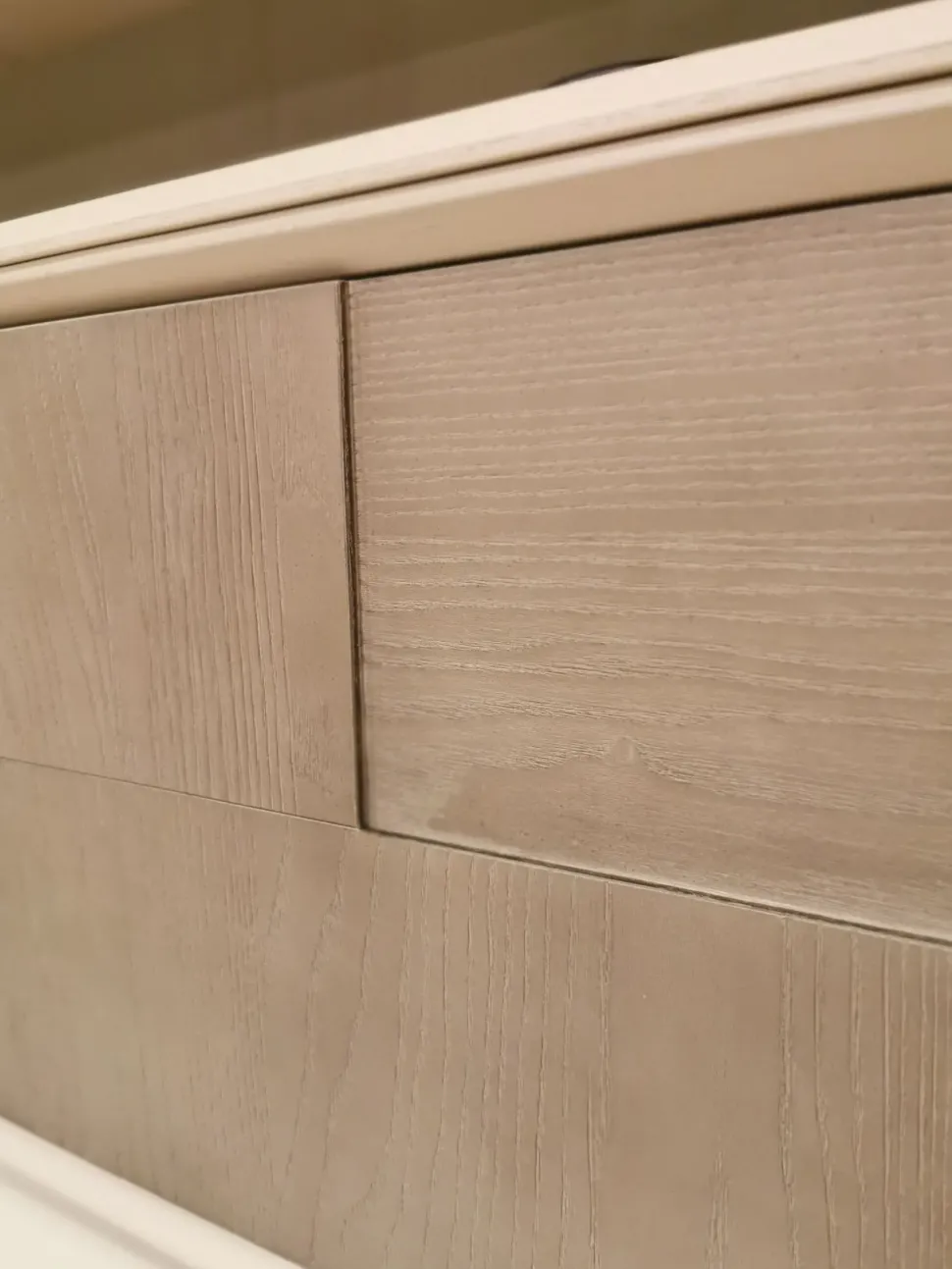 Parete attrezzata Le Fablier mod. Le Spezie. Materiale legno di frassino semi-fiammato spazzolato. Dimensioni (in cm): L.360 – P.55- H.200. Finiture avorio e grigio.