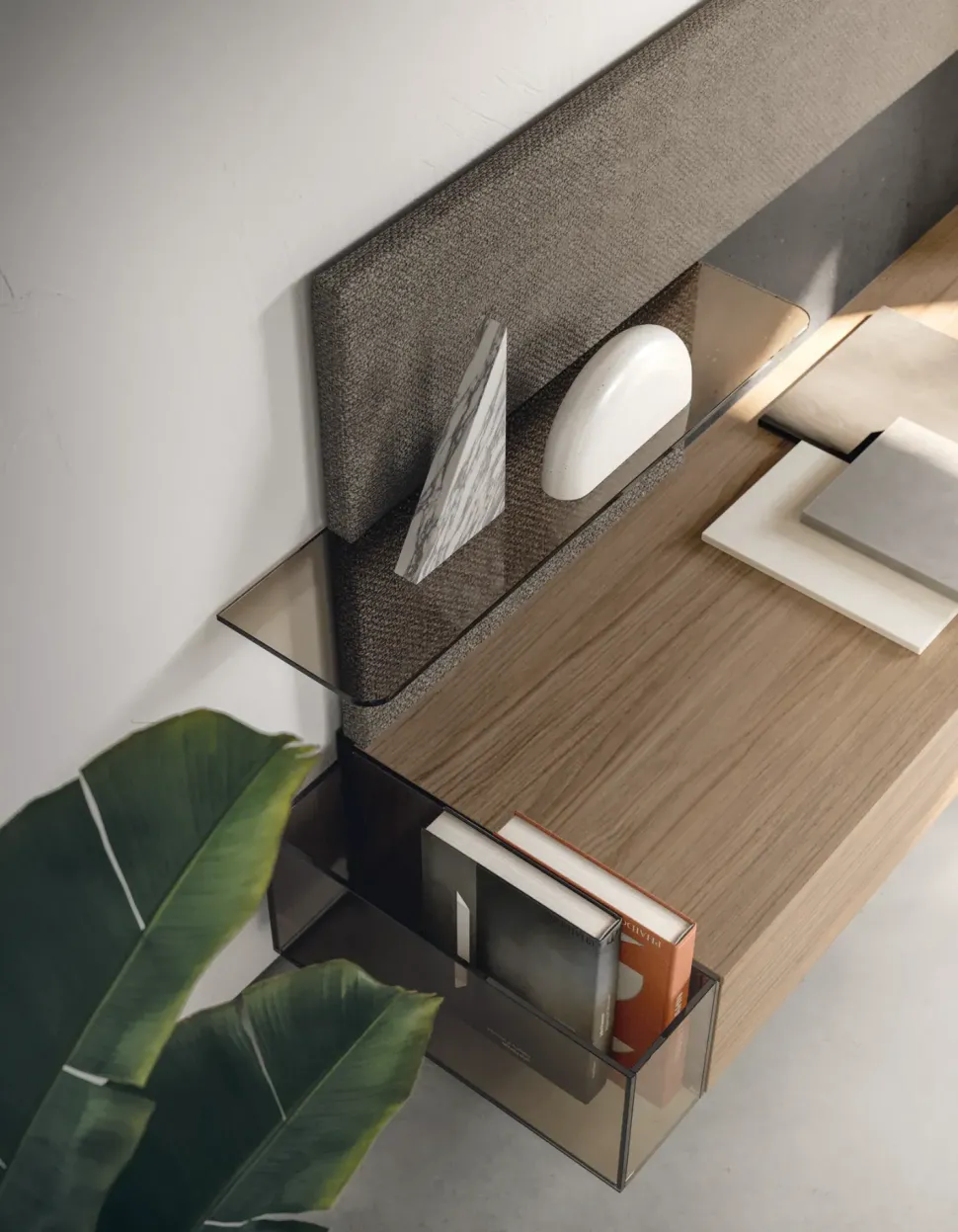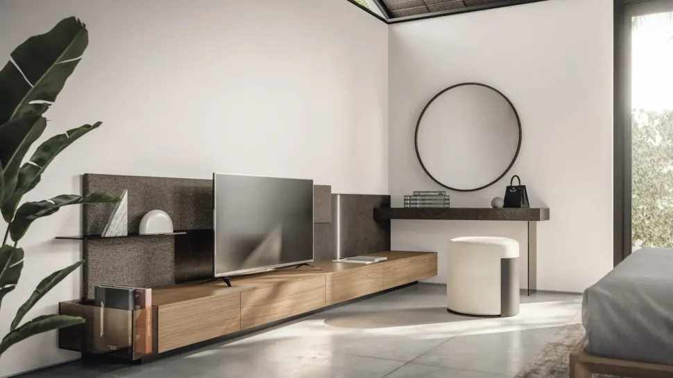 Questa composizione è caratterizzata da finiture in essenza, laccato opaco, tessuto e vetro stopsol.