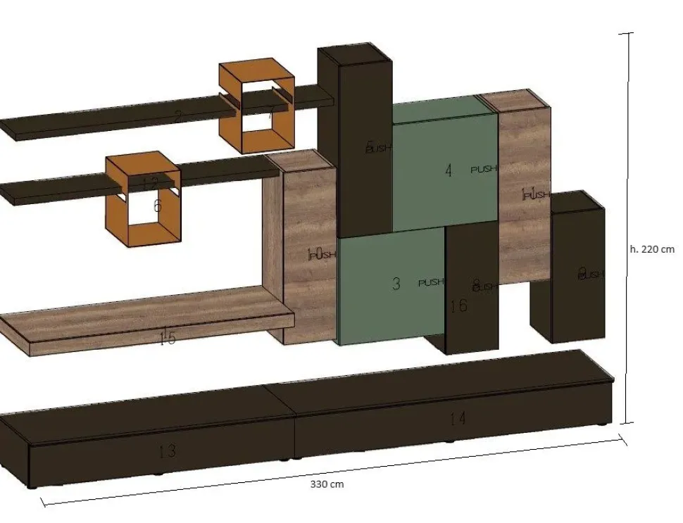 Parete attrezzata composizione mix colori con base a terra con cassettoni, pensili (sistema apertura push and pull) e ripiani sospesi con elementi metallici a giorno; Dimensioni: L. 330 cm x P. 53 cm x H. 220 cm. Finitura basi a terra e top basi: Laccato opaco Caffè; Finitura pensili anta Push and pull: mix colori Rovere Tabacco, Laccato opaco Oliva, Laccato opaco Caffè; Finitura mensolone: Rovere Tabacco; Finitura elementi metallici a giorno: Miele RAL 8001. Possibilità di abbinare tavolo, sedie e madia con stessa finitura e colore. Possibilità di variare composizione in dimensioni e finiture con consulenza e progettazione personalizzata gratuita.