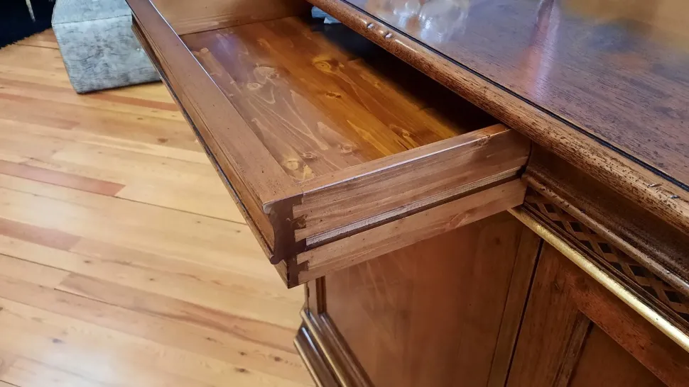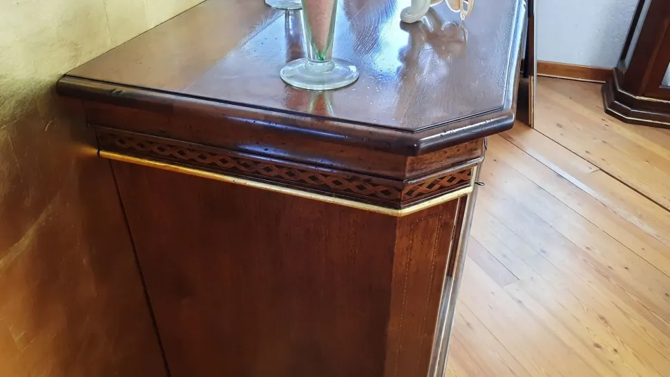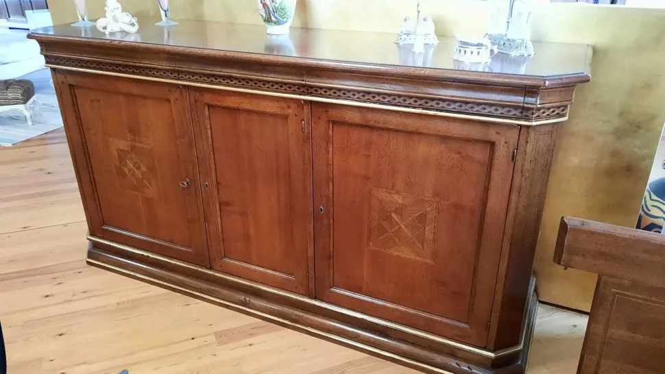Credenza artigianale massiccia di noce con intarsi e cassetto segreto , misure :220x60x114h
