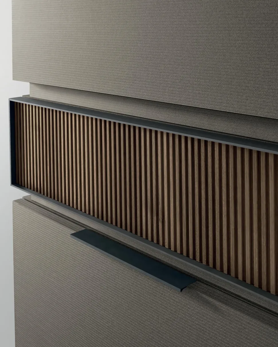 Finiture materico paglia bronzo, materico opaco antracite, legno noce canettè e metallo antracite.