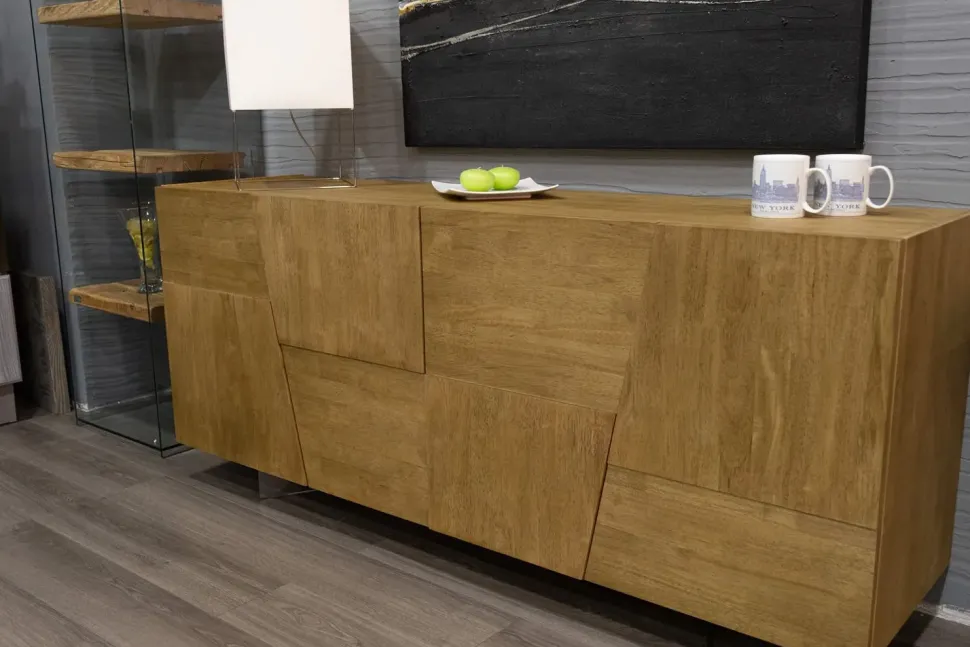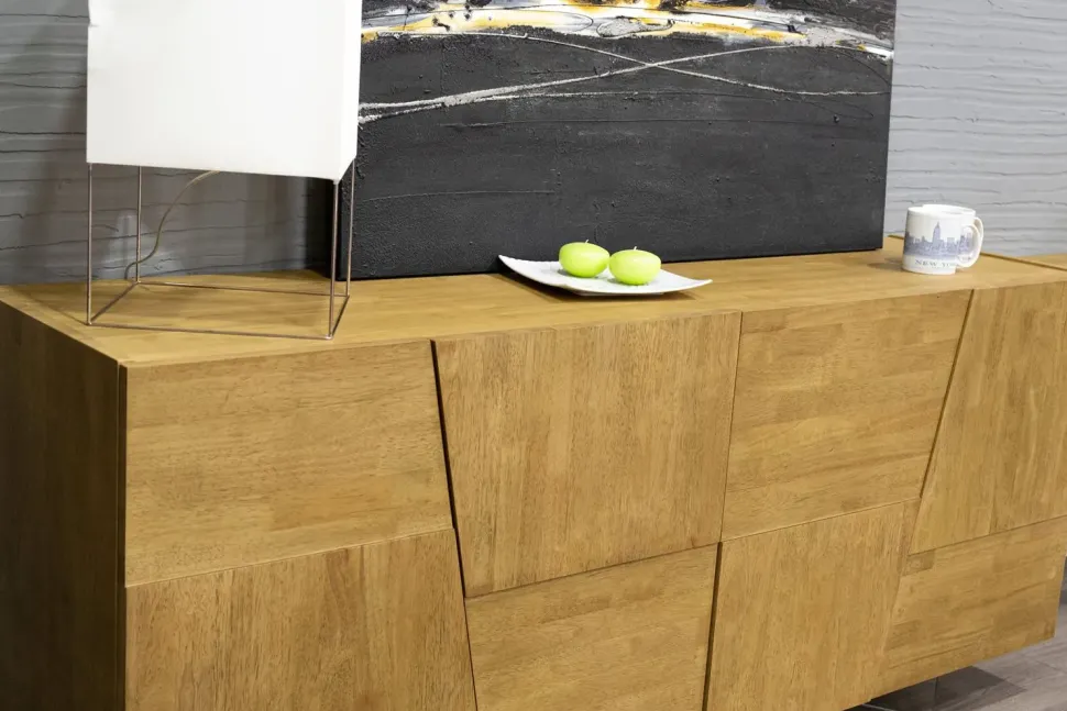 La madia modello Trapeze qui visibile saprà completare il tuo soggiorno sottolineando il valore estetico dell’ambiente: questo mobile in legno ti consentirà di avere sempre a disposizione una superficie di appoggio plurifunzionale, esaltando allo stesso tempo lo stile moderno del soggiorno.