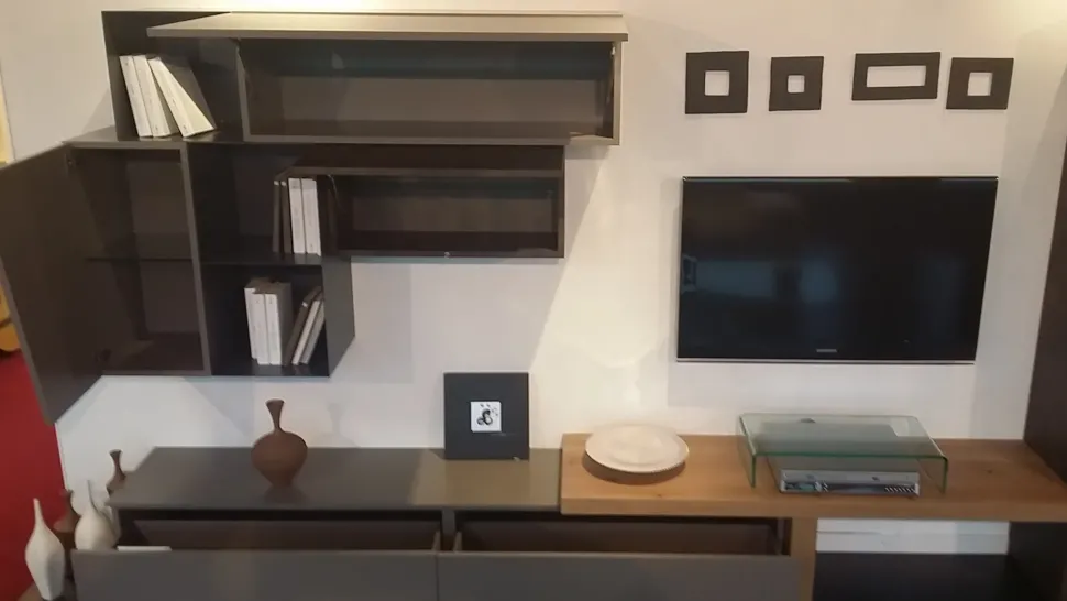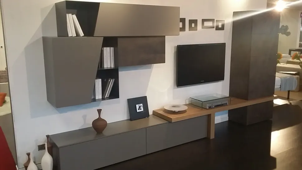 Gli elementi che compongono la composizione sono in diverse finiture e vanno dal materico Maya Bronze al metallo laccato opaco Antracite al legno di Rovere nodato e al laccato opaco colore Piacenza.