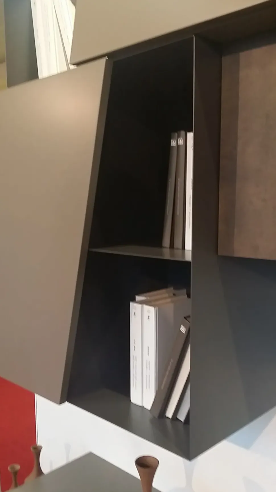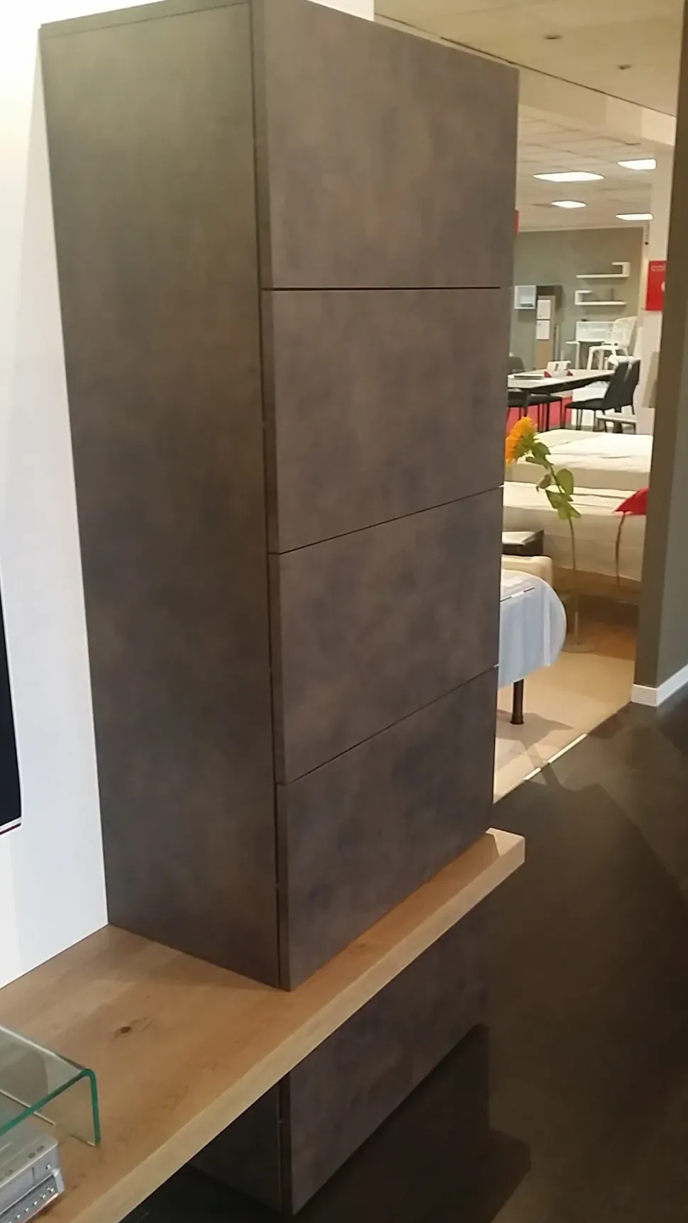 La caratteristica dei pensili con taglio diagonale ed il totem verticale rende unica questa composizione che offre tanto contenimento senza rinunciare all’estetica, misura d’ingombro cm. 378×30-47prof.x207h. ca