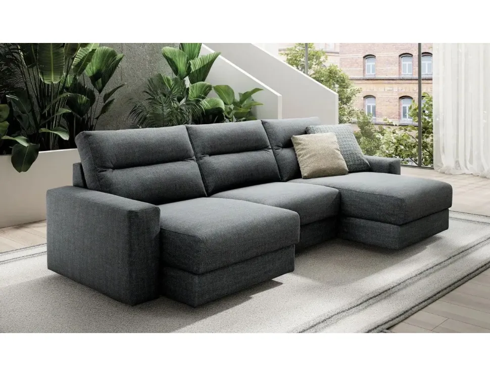 - È un divano a penisola, con quattro posti, seduta allungabile e imbottitura in poliuretano, ideale per arredare qualsiasi ambiente.