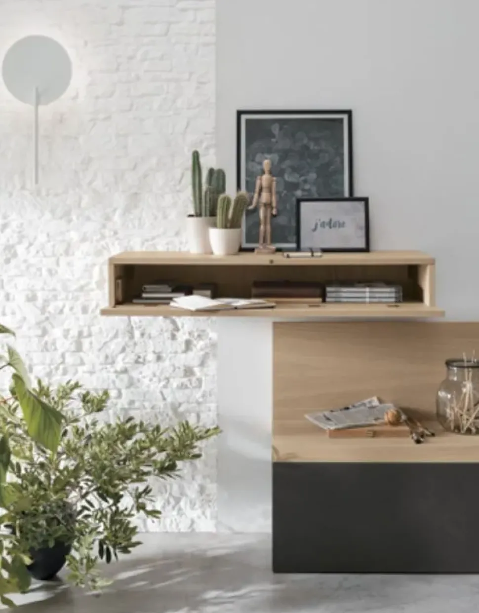 Finiture della composizione: Materico rovere sabbia, Materico cemento scuro, Metallo antracite n. 160.