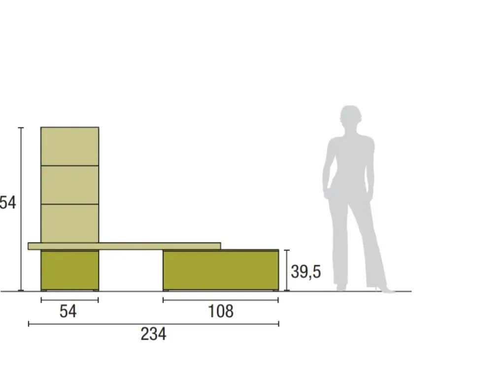 Il mobile in offerta si compone di due elementi a terra: un cestone da 108x40x36 cm e un contenitore con anta da 54x40x36 cm. A separarli dal totem in appoggio con tre ante da 54x40x108 cm, un pianale sovrapposto da 180x47x5,8 cm.