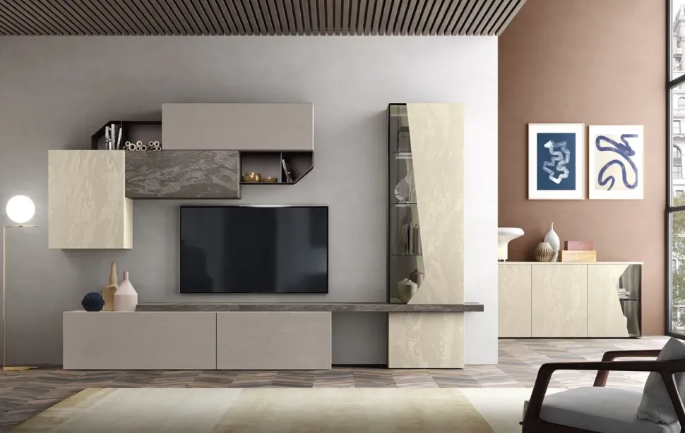 Il soggiorno si compone di vari mobili e complementi capaci di ultimare lo spazio ottimizzando ogni angolo ; tra questi c’è sempre una parete attrezzata come il modello Corso 11 di Corso mostrato in foto, studiata per dare vita a un soggiorno pratico e operativo.
