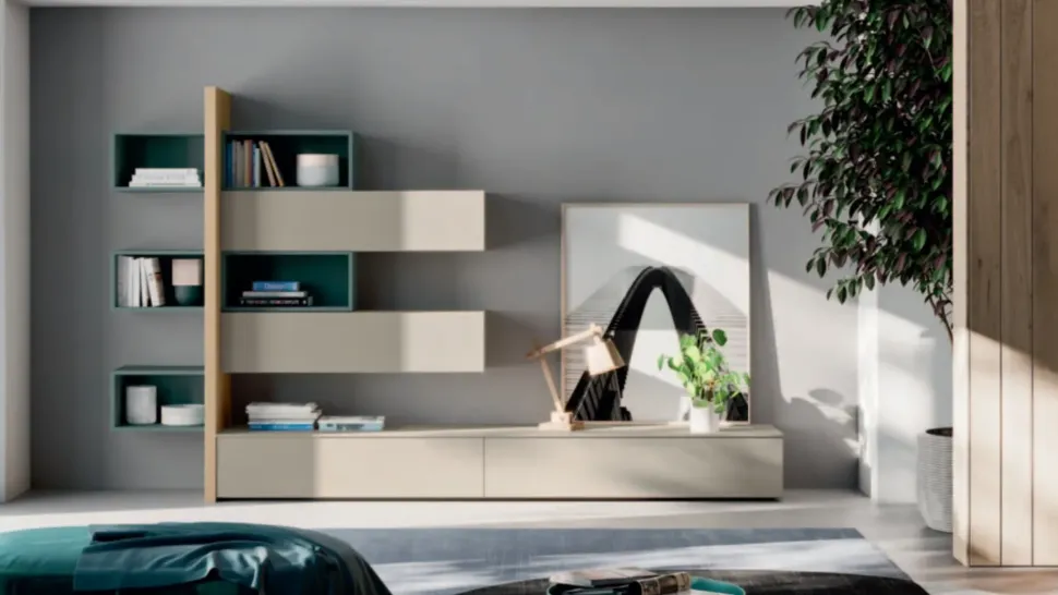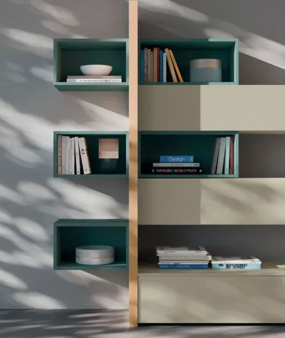 I moduli chiusi in una tonalità beige opaca si alternano a vani a giorno incassati in un verde petrolio, offrendo un piacevole contrasto cromatico che dona carattere senza risultare invadente.