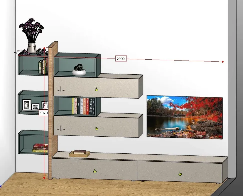 Questa parete attrezzata L290 H 186 , si distingue per il suo design semplice ed elegante, ideale per ambienti di piccole o medie dimensioni. La composizione si sviluppa in orizzontale con linee pulite e volumi ben bilanciati, contribuendo a creare un atmosfera ordinata e ariosa.