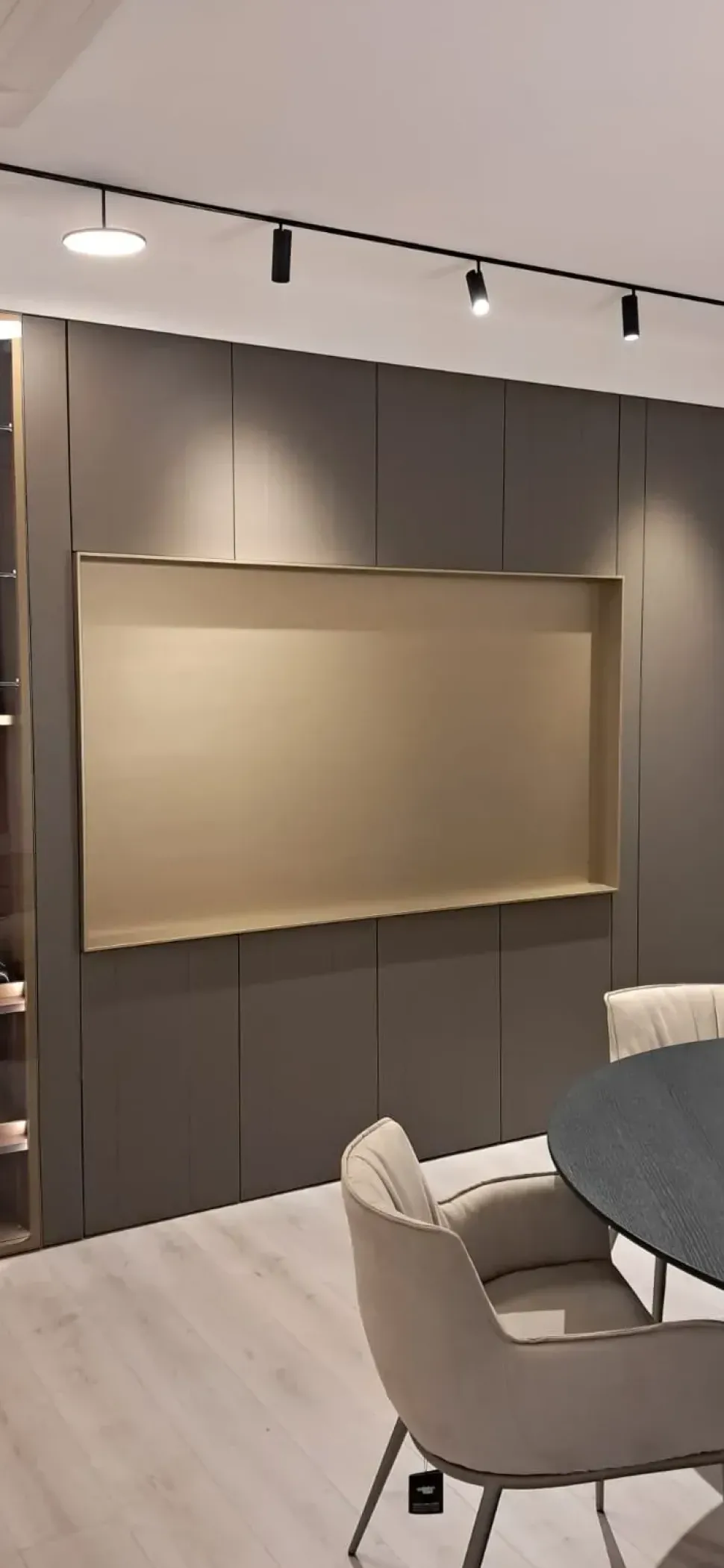 Parete attrezzata in legno laccato opaco fango, telaio e box porta tv champagne( 192x108h) , vani contenitore con apertura push pull.