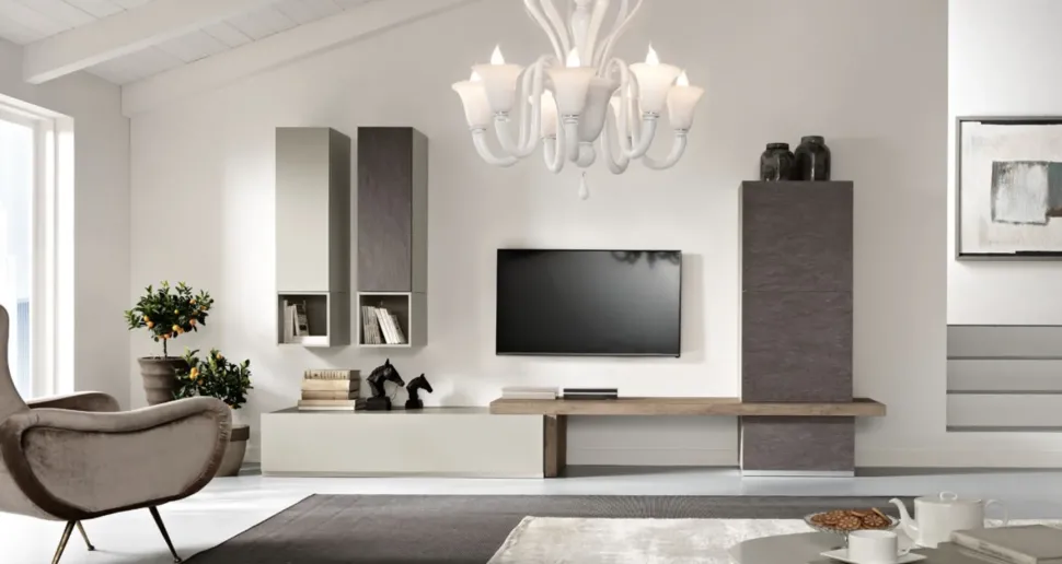 - Questa composizione per il soggiorno si rivelerà la soluzione ottimale se desideri una parete attrezzata push–pull dalle forme decise.