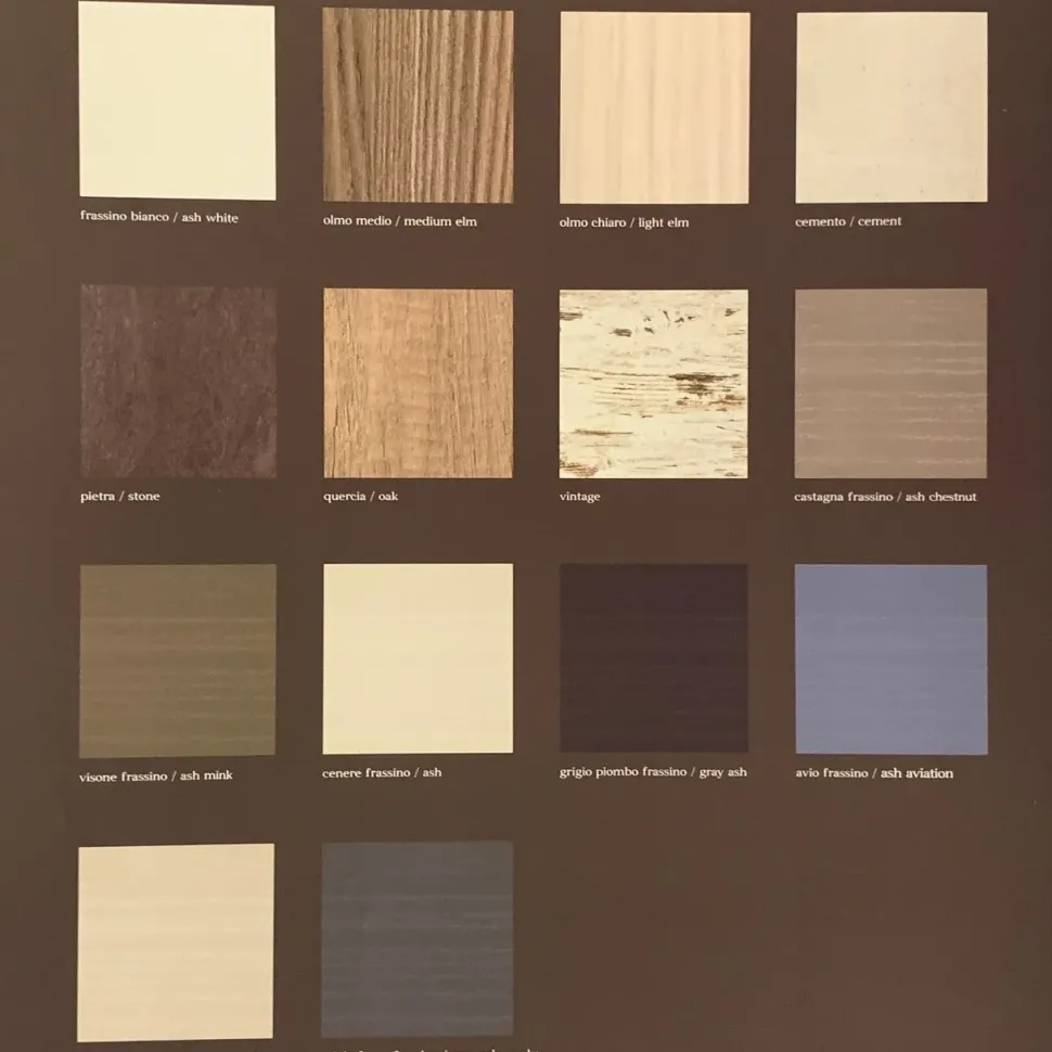 Struttura in frassino laccato Cenere; frontali in frassino laccato Cenere e Pietra; elementi a giorno in laccato Cenere opaco e panca in quercia. Disponibile in altre finiture (maggiori informazioni nelle immagini).