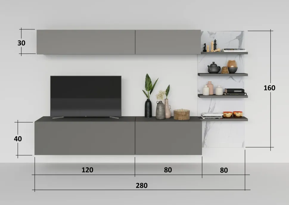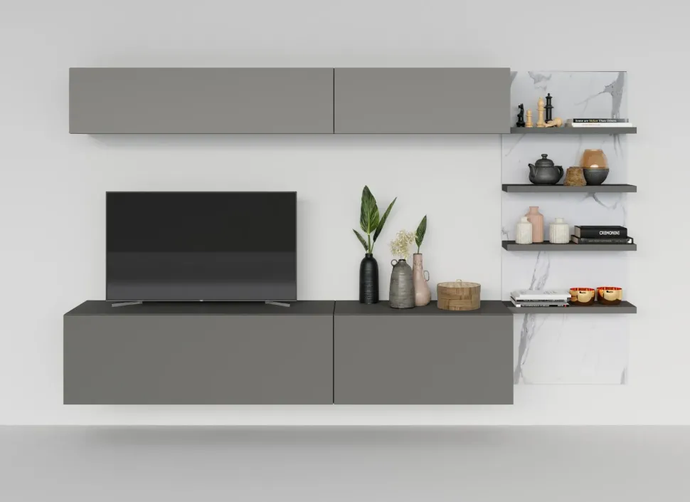 - Se vuoi arricchire il soggiorno con un mobile sospeso, scopri questa parete attrezzata in offerta: saprà rendere lo spazio operativo e pratico senza essere di intralcio.