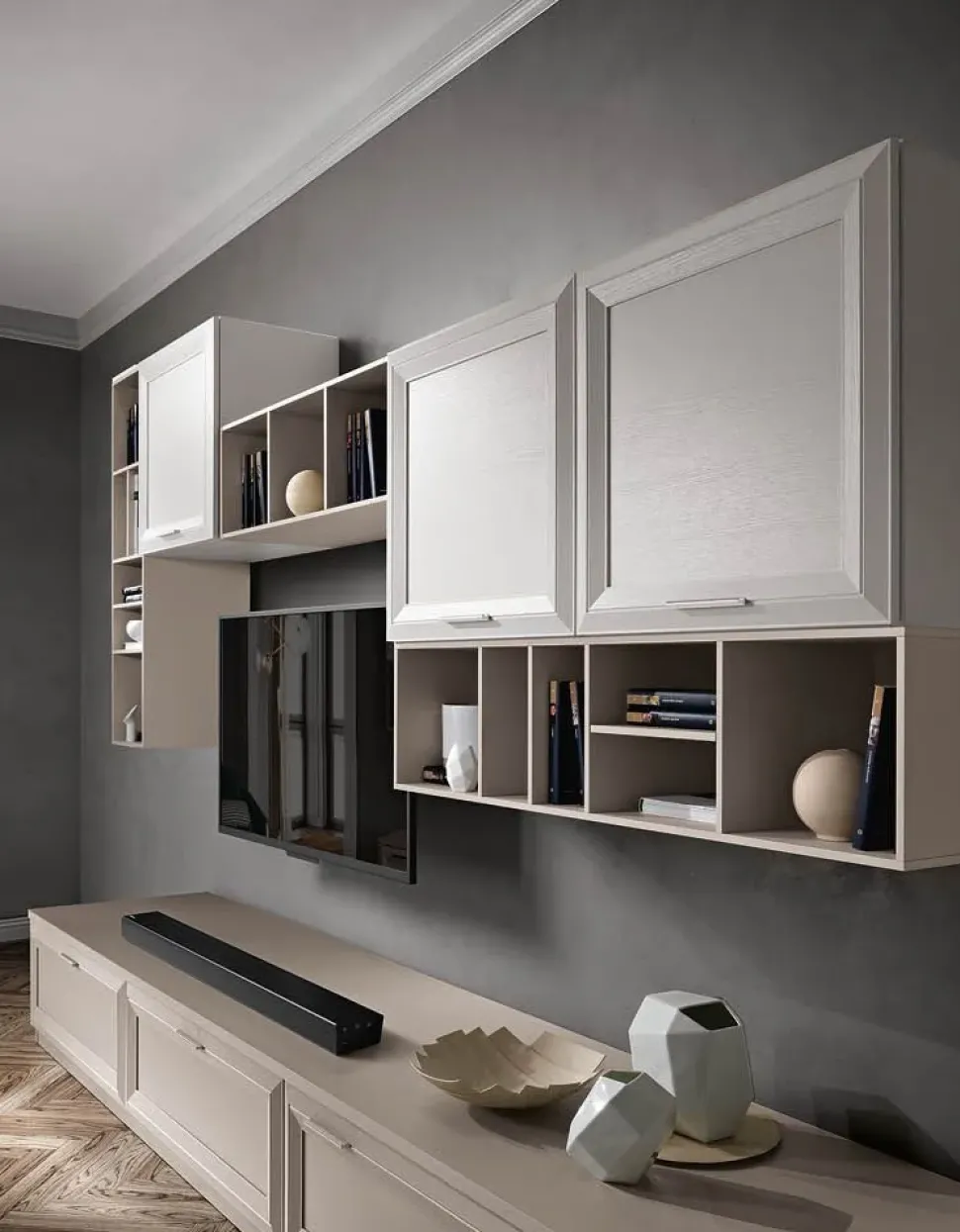 I mobili ed elementi accessori per la zona giorno consentono di personalizzare lo spazio creando particolari atmosfere: se desideri un soggiorno design, la parete attrezzata nell’immagine è l’ideale.