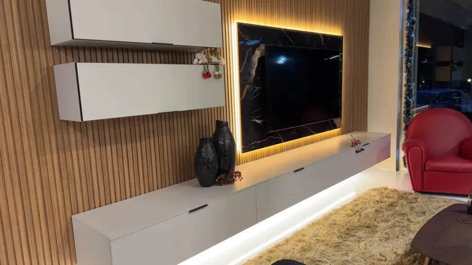 Parete attrezzata Zalf con pannellatura dogata in MDF ed elemento porta tv effetto marmo retroilluminato.